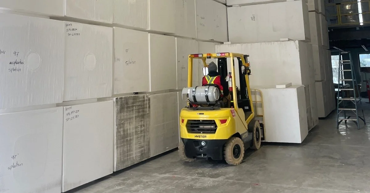 These large blocks are now being stored in the warehouse and will be precision-cut to form the insulated wall systems used in the Splatsin Homes building process. Once the warehouse is fully stocked, it will hold approximately 100 foam blocks, giving the team the ability to cut the components needed for three to four homes, including the Splatsin Homes show home currently under construction.